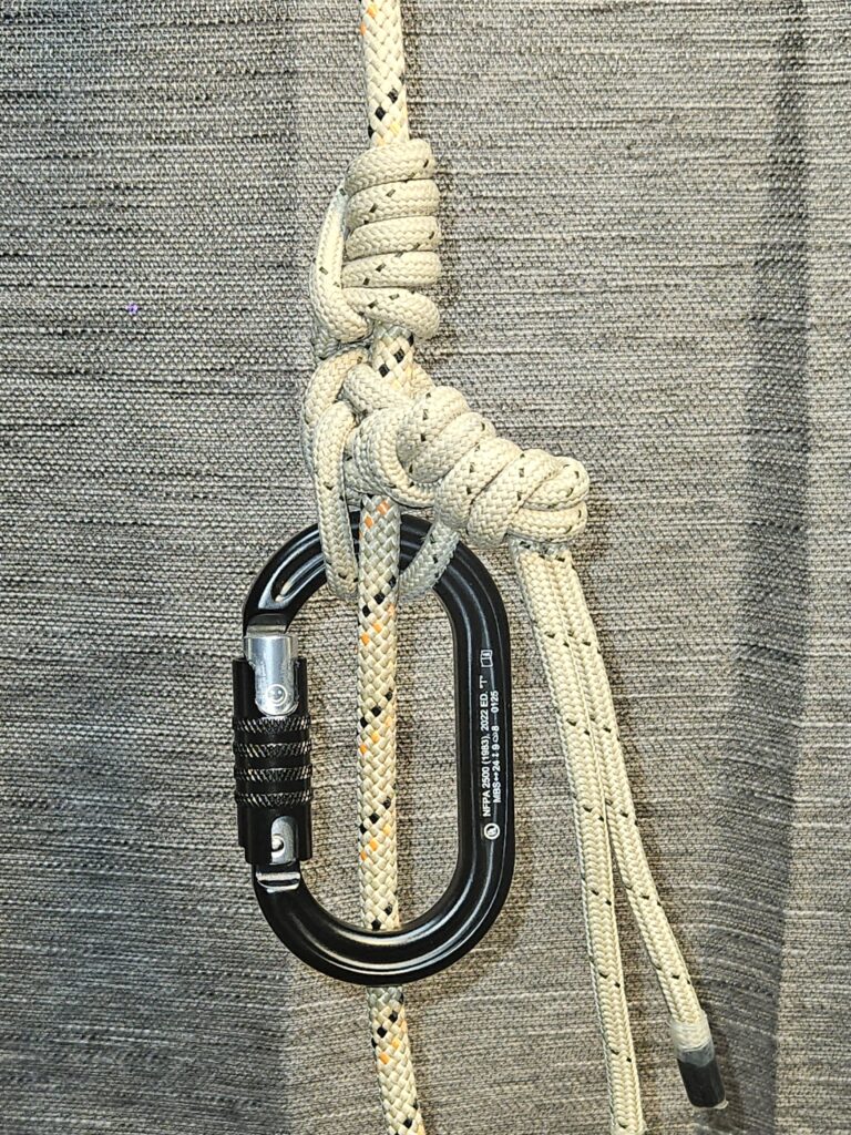 This photo shows the correct positioning of the carabiner around the rope for optimal tending.